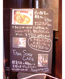 笹野さんとフジモトさんは昨年10月、赤坂にファンソンカフェをオープンしました。京都のオーガニックコーヒー、酵素玄米のカレー、手作りNYチーズケーキが自慢のお店です。ビジネス街にあるとは思えない程、静かで落ち着けるお店。ある常連さん曰く「店のガラスを隔てて結界に守られたようなカフェ」だとか。― 色んな偶然が重なってカフェをすることになったとのことですが(詳しくは「犬の居ぬ間に」6月13日の書簡参照)、とは言っても、いきなり人に出せるような料理は作れないと思いますが? 「思い切りも必要だと思います。今日から私はプロと決めたら、プロ。何事でもそうじゃないですか? “今日から私、美味しいもの出します。以上!”と決めて、後から実力がついてくるようなところもあると思います。メニューもこれから増やしたいし、季節ごとに変えたメニューも出せるようになりたいです……といいつつ、かなりユルユルでここまでやってきているのですが。」 ― お店の仕事はどのように分担されているのですか? 「私は計算がすごく苦手なので、経営関係はフジモトがやっています。私は目の前にある玄米を炊いたり、カレーをかき混ぜたり。メニューは最初二人で考えましたが、メニュー表やサイトにあれこれ書いてあるうんちくは全てフジモトです。うんちく書き屋としてデビューさせたら儲かるんじゃないかというぐらいすごいです。お店の名前の“ファンソン”は中国語でリラックスという意味で、太極拳の用語でもあります。リラックスしているけど、次の動作にすぐ出られるような、ピリッと筋の通った脱力の状態だそうです。フジモトが太極拳をやっているので、そのコンセプトもフジモトが考えました。看板犬の部分はCandyがやっています。それぞれがお互いの持ち場を尊重するようにしています。」 | |||||