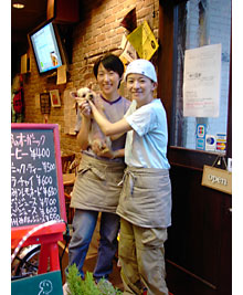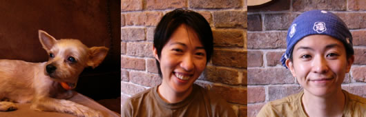 ![]() 左より、看板犬Candy、笹野さんのパートナー・フジモトさん、名シェフ・笹野さん